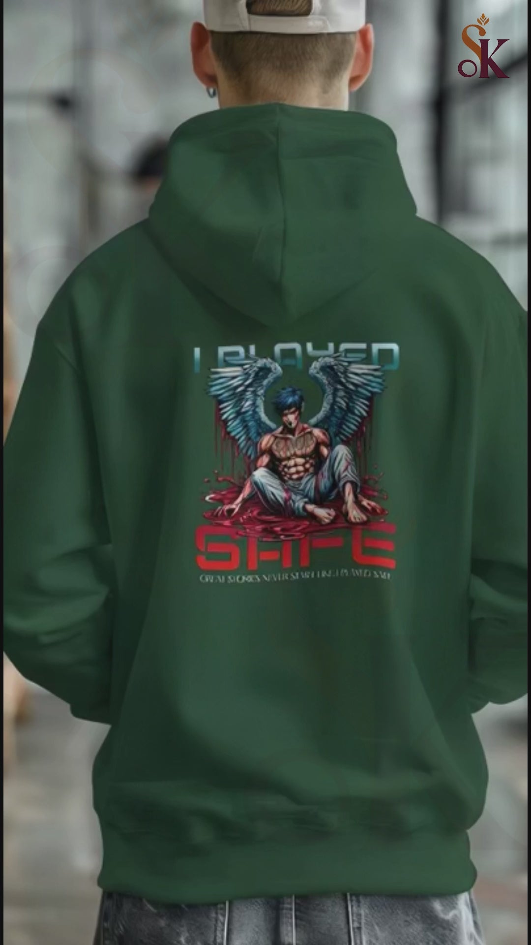 “I Played Safe” — and ended up broken. But greatness doesn’t come from comfort. It comes from risk, sacrifice, and the scars that tell your story. The No Safe Games hoodie by Skarva Couture features an angelic warrior, bloodied but unbowed, resting in defeat — or maybe on the verge of a comeback. Below him, the words pierce deeper than ink: “Only stories never start like: I played safe.”